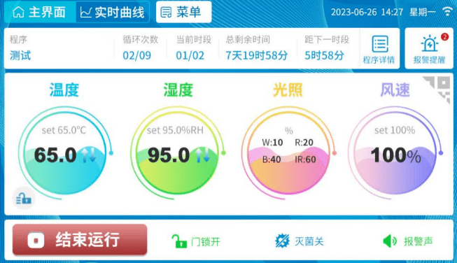 七寸全彩觸摸屏:操作界面友好;屏幕高度符合人體工程學(xué)設(shè)計(jì);一屏查看/設(shè)置溫度、濕度、光照等多項(xiàng)參數(shù),無需切換界面;全景鋼化玻璃內(nèi)門:減少箱體內(nèi)溫濕度變化,方便觀察內(nèi)部實(shí)驗(yàn)情況;背出風(fēng)系統(tǒng):采用大面積矩陣網(wǎng)孔出風(fēng)結(jié)構(gòu)設(shè)計(jì),確保氣流平穩(wěn),配合風(fēng)速調(diào)控功能,實(shí)現(xiàn)箱體內(nèi)部溫度、濕度、風(fēng)速均勻分布;電磁鎖與屏幕鎖雙重防護(hù):確保培養(yǎng)箱外門與操作屏幕的安全,用戶需輸入正確密碼方可解鎖,有效保護(hù)實(shí)驗(yàn)樣本免受未經(jīng)授權(quán)的訪問,提升實(shí)驗(yàn)安全性與數(shù)據(jù)保密性;內(nèi)置超聲波加濕系統(tǒng):加一次水可用3個(gè)月;兼容?外接自動(dòng)供水裝置實(shí)現(xiàn)便捷補(bǔ)水;時(shí)段設(shè)置功能:可設(shè)置多個(gè)時(shí)段,可單獨(dú)設(shè)置每個(gè)時(shí)段的運(yùn)行時(shí)間模擬出各種氣候條件;遠(yuǎn)程數(shù)據(jù)管理及控制:可通過PC端Web平臺(tái)、App、微信公眾號(hào)實(shí)現(xiàn)設(shè)備與實(shí)驗(yàn)程序的遠(yuǎn)程操控、實(shí)時(shí)查看、信息推送能功能;
